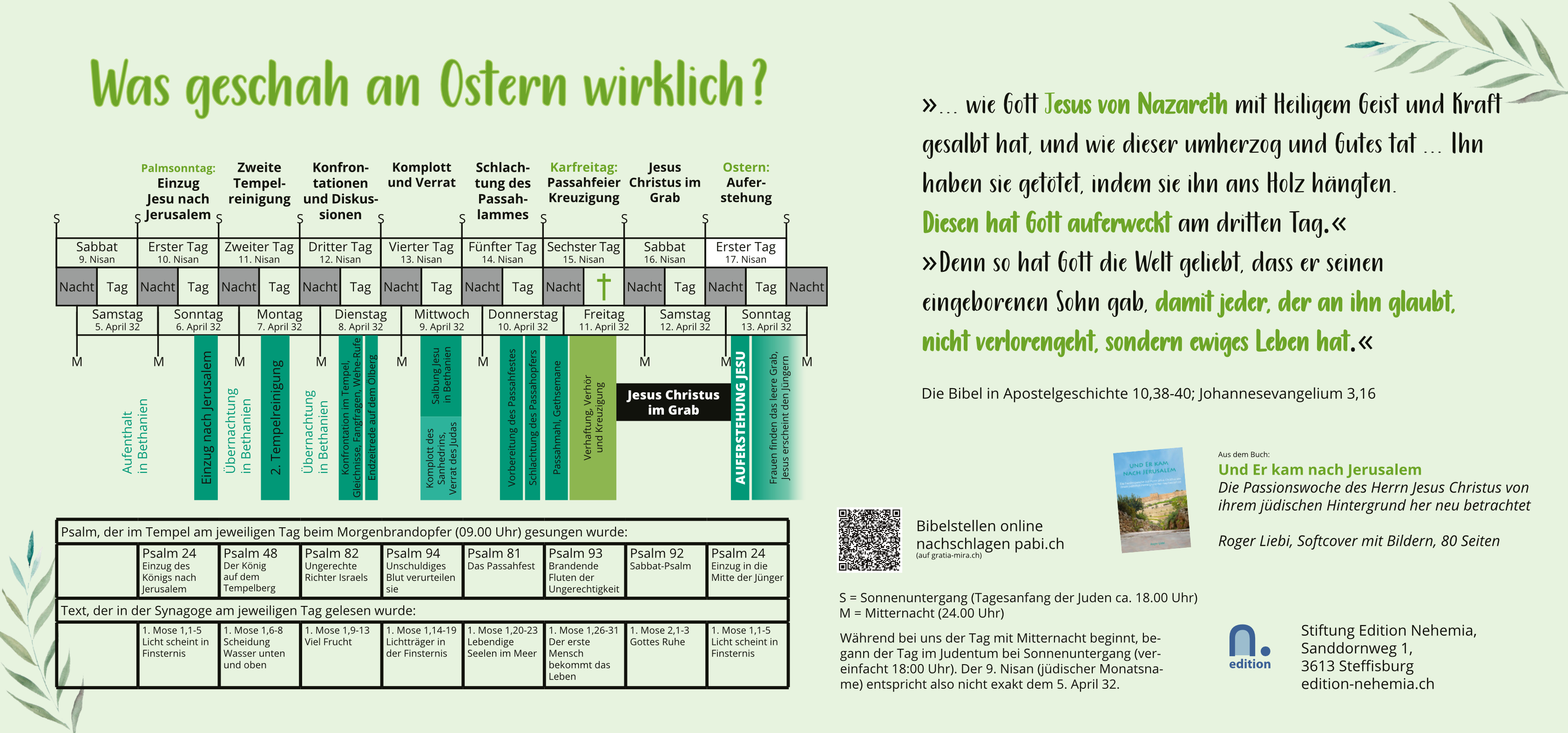 Etwa ein Drittel der Berichte über das Leben des Herrn Jesus – den Evangelien – fokussiert unseren Blick auf die letzte Woche, in welcher der Herr Jesus zuletzt für unsere Sünden litt und schliesslich auferstand. Das, was vor vielen Jahren um die Zeit des Passahfestes geschah, muss also von grosser Bedeutung sein!